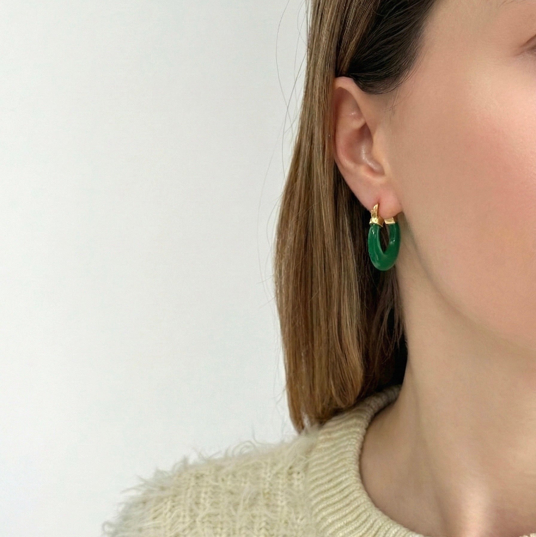 These elegant hoop earrings feature a gold plated metal clasp and hinge. The main body of the hoop is made from resin that resembles jade, formed into a thick, rounded oval shape. They are a perfect blend of classic gold and fresh color, adding a touch of sophistication to any look.
